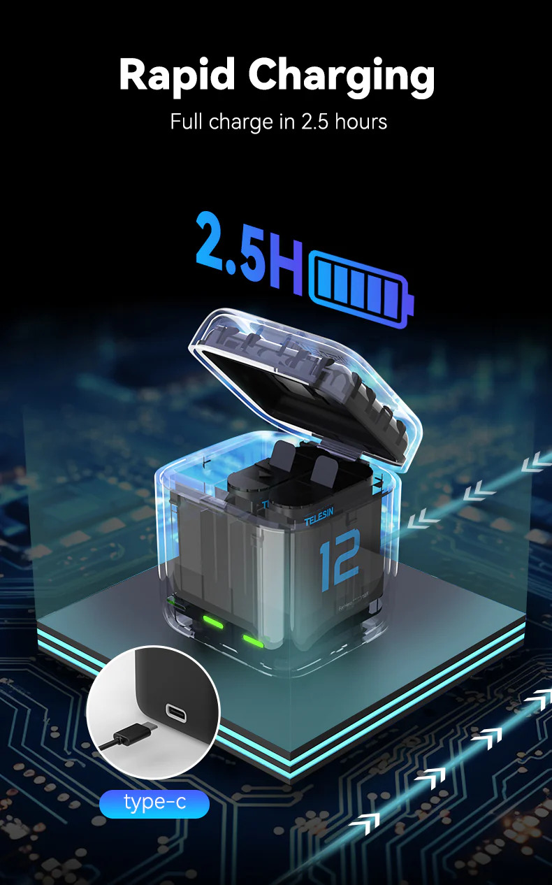 TELESIN 3 Slots LED Storage Charger Box with 2 Extended Battery(Fast Charging) for GoPro 9/10/11/12(GP-BNC-901-B)