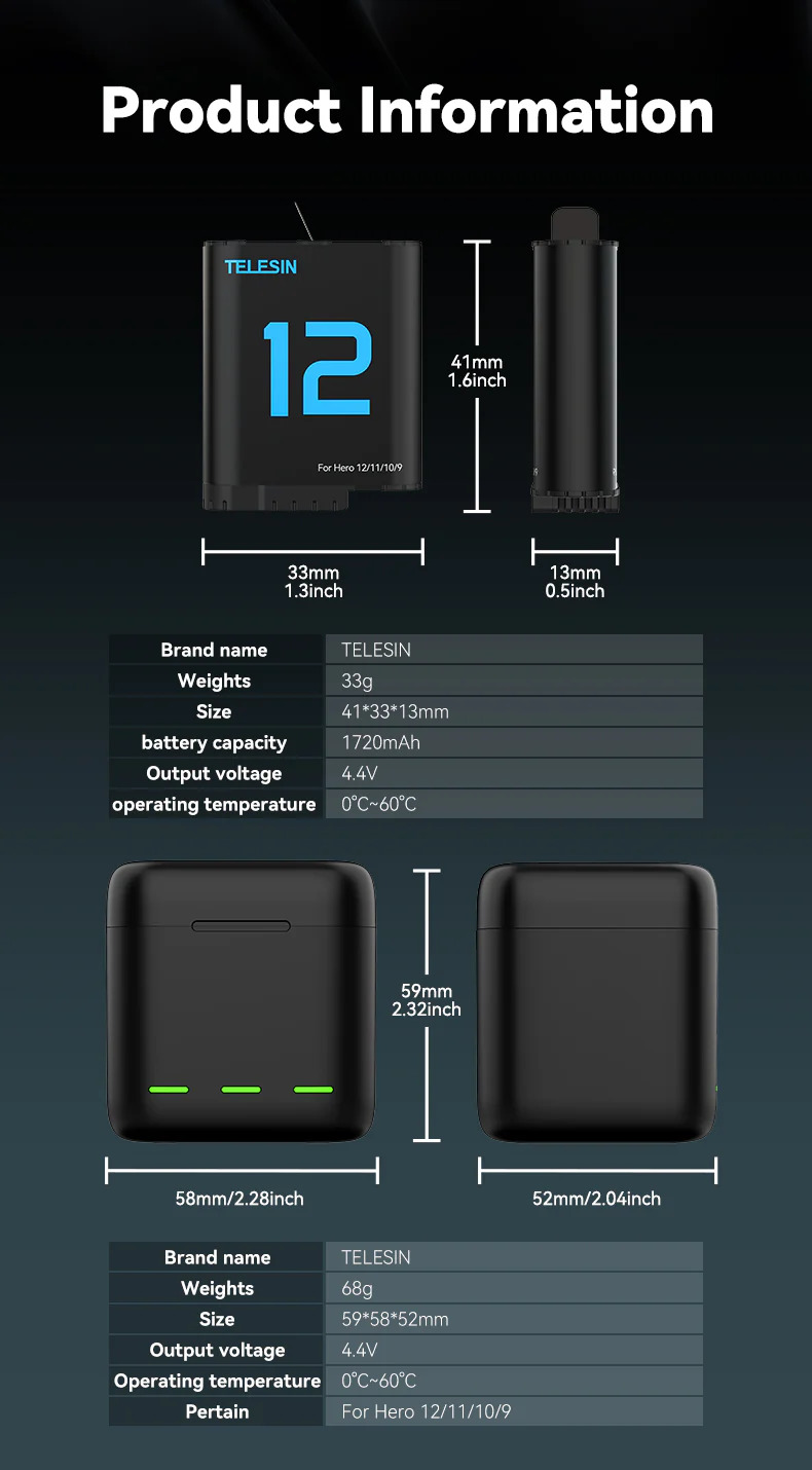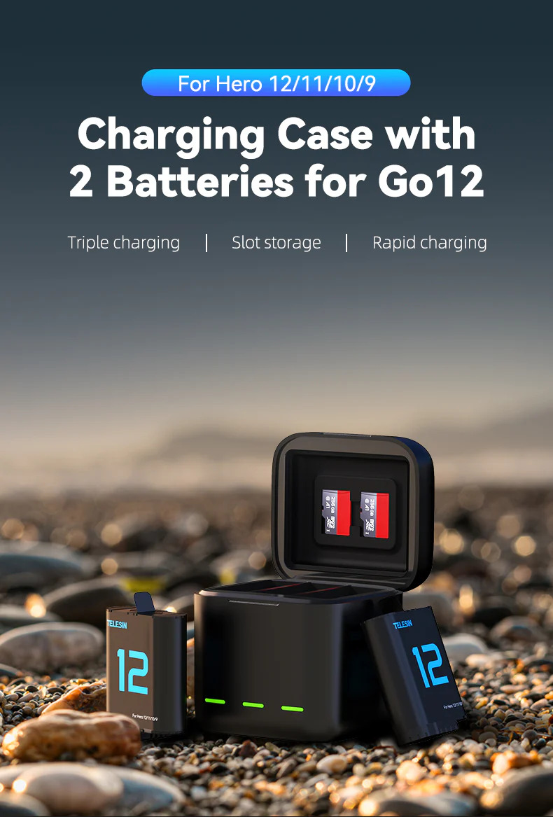 HomeCamera & PhotosAction CameraAction Camera Accessories TELESIN 3 Slots LED Storage Charger Box with 2 Extended Battery(Double Arc)for GoPro 9/10/11/12(S0-BCG-04-TGP)